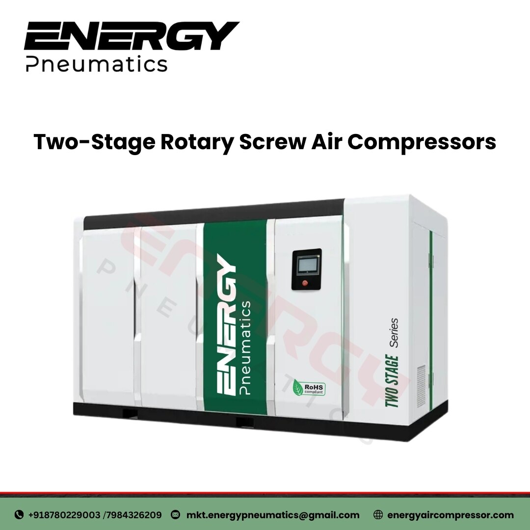 Two Stage Compressor Manufacturers & Suppliers in Ahmedabad, Gujarat, India | Energy Pneumatics. Energy Pneumatics offers high-performance screw compressors designed for efficiency and reliability. Our Premium Series includes models like the 100 HP, 75 HP, 120 HP, and 20 HP air compressors, with power ranging from 30-150 kW and pressures from 7-10 bar. Equipped with Permanent Magnet Motors, they deliver energy savings and long-lasting performance. For more information, Download Our Brochure or Send an Inquiry. We're committed to providing the best air compression solutions for your business needs. Call Us For More Information.